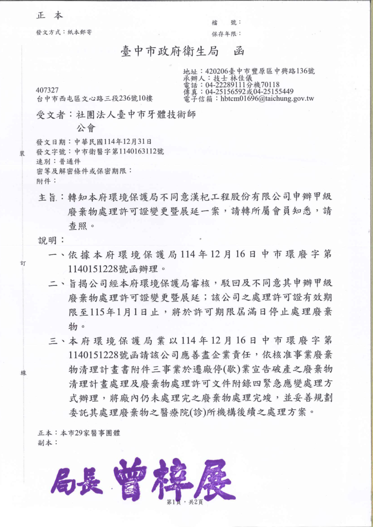 轉知-臺中市政府衛生局-中市衛醫字第1140163112號2026.1.6/在: 公告公文, 最新消息 https://tcdta.org.tw/wp-content/uploads/2026/01/115.1.6_臺中市政府衛生局-轉知本府環保局不同意漢杞工程股份有限公司申辦甲級廢棄物處理許可變更暨展延案.jpg 2340 1654 txgdta /wp-content/uploads/2022/12/logo3.png txgdta2026-01-06 15:24:342026-01-06 15:24:34轉知-臺中市政府衛生局-中市衛醫字第1140163112號