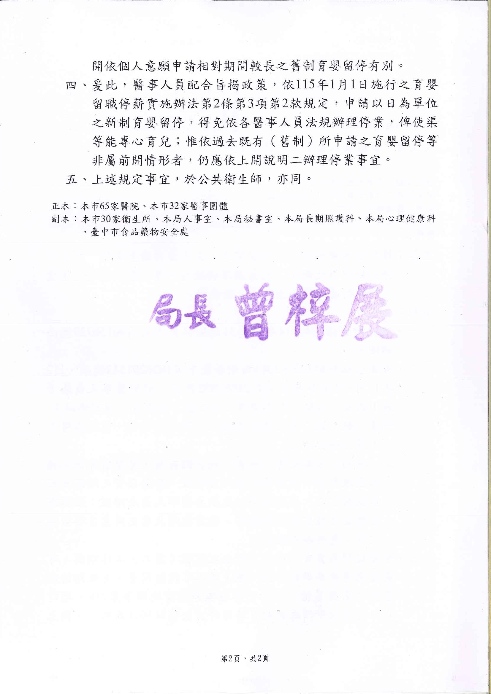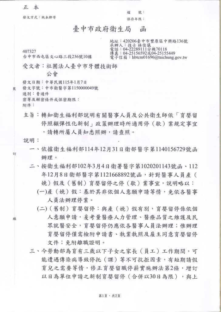 轉知-臺中市政府衛生局-中市衛醫字第1150000049號2026.1.9/在: 公告公文, 最新消息 https://tcdta.org.tw/wp-content/uploads/2026/01/115.1.9_臺中市政府衛生局_轉知衛生福利部說明有關醫事人員及公共衛生師依「育嬰留停照顧彈性化新制」-1-rotated.jpg 2340 1654 txgdta /wp-content/uploads/2022/12/logo3.png txgdta2026-01-09 15:05:342026-01-09 15:05:34轉知-臺中市政府衛生局-中市衛醫字第1150000049號
