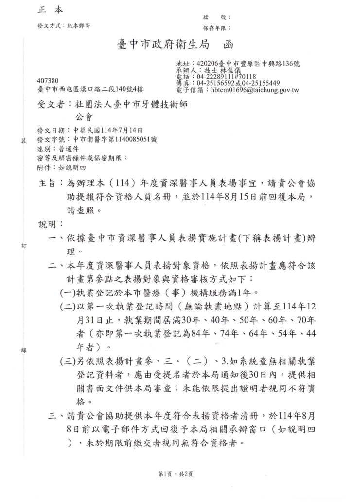 轉知_臺中市政府衛生局_辦理114年度資深醫事人員表揚